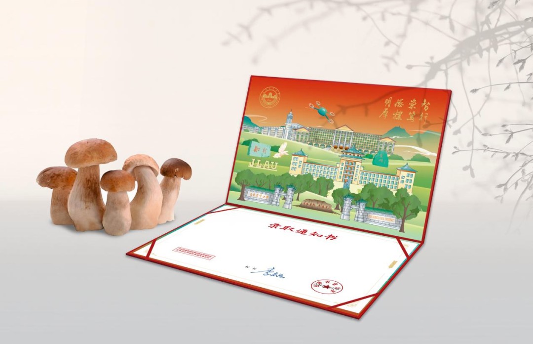 據該校官方微信顯示,今年錄取通知書整體以紅色為主調,內頁是中國工程院院士、吉林農業大學教授李玉帶領菌物科學與工程團隊研發的“蘑菇紙”。