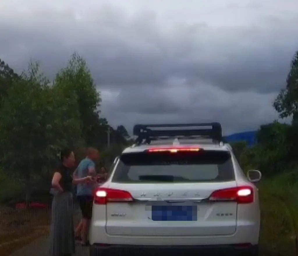 跟在“平頭哥”車後的車輛,其記錄儀拍到了上述畫面:女子右手拿着手機,將左手中攥着的物品展示了一下,女子又稱報警。