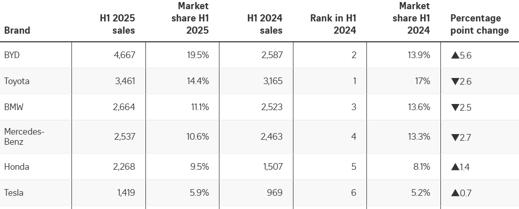 根據新加坡交通部陸路交通管理局 (LTA)本週發佈的最新數據,比亞迪成為2025年上半年新加坡最暢銷的汽車品牌,新註冊汽車數量為4667輛,是排在第6名的電車競爭對手特斯拉(1419輛)的三倍多,佔據了同期新車市場總量的19.5%。