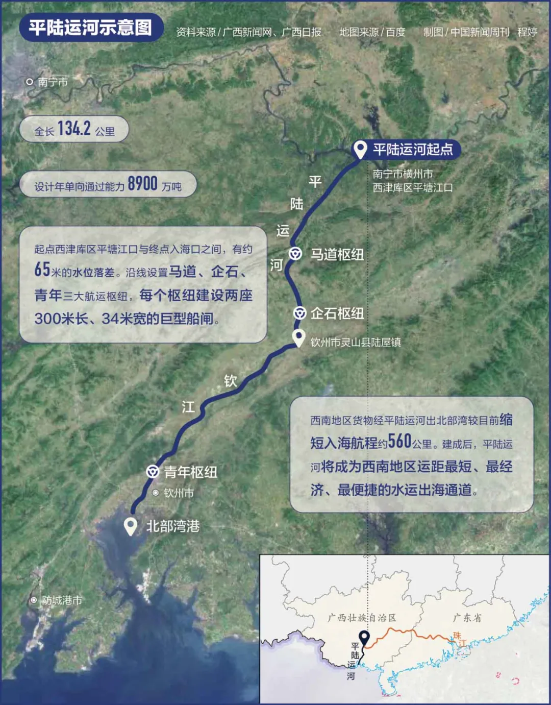 這條全長134.2公里的運河,始於南寧橫州市西津庫區平塘江口,經欽州靈山縣陸屋鎮沿欽江進入北部灣,項目總投資約727億元。建成後,廣西乃至西南地區的貨物經平陸運河出海,航程可節省約560公里。