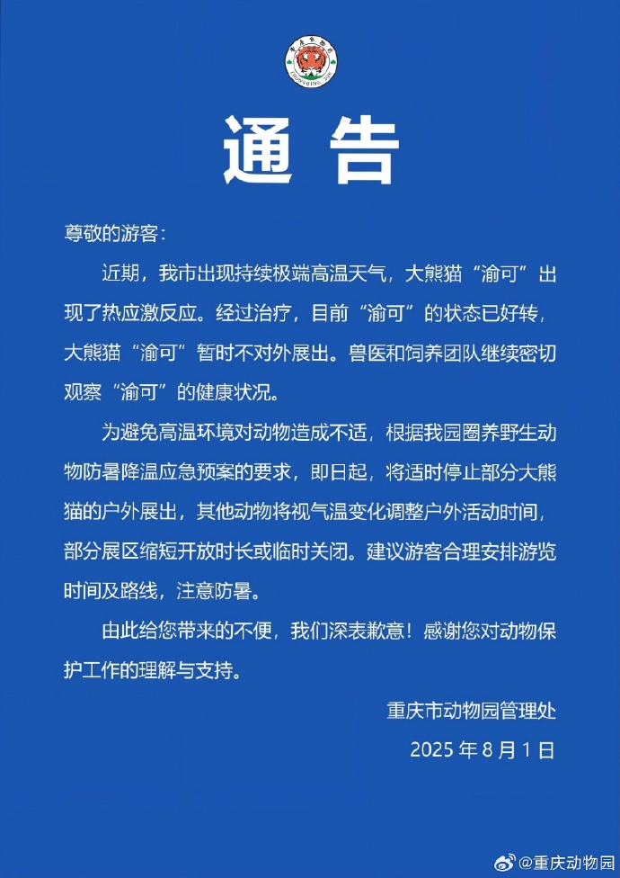@重慶動物園 8月1日發佈通告稱,近期重慶市出現持續極端高温天氣,大熊貓“渝可”出現熱應激反應。經過治療,目前“渝可”的狀態已好轉,大熊貓“渝可”暫時不對外展出。獸醫和飼養團隊繼續密切觀察“渝可”的健康狀況。
