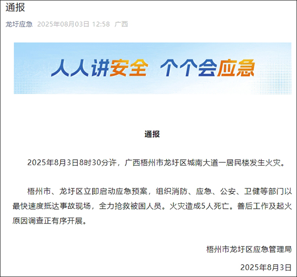 廣西梧州市龍圩區應急管理局微信公眾號“龍圩應急”消息,8月3日8時30分許,廣西梧州市龍圩區城南大道一居民樓發生火災。