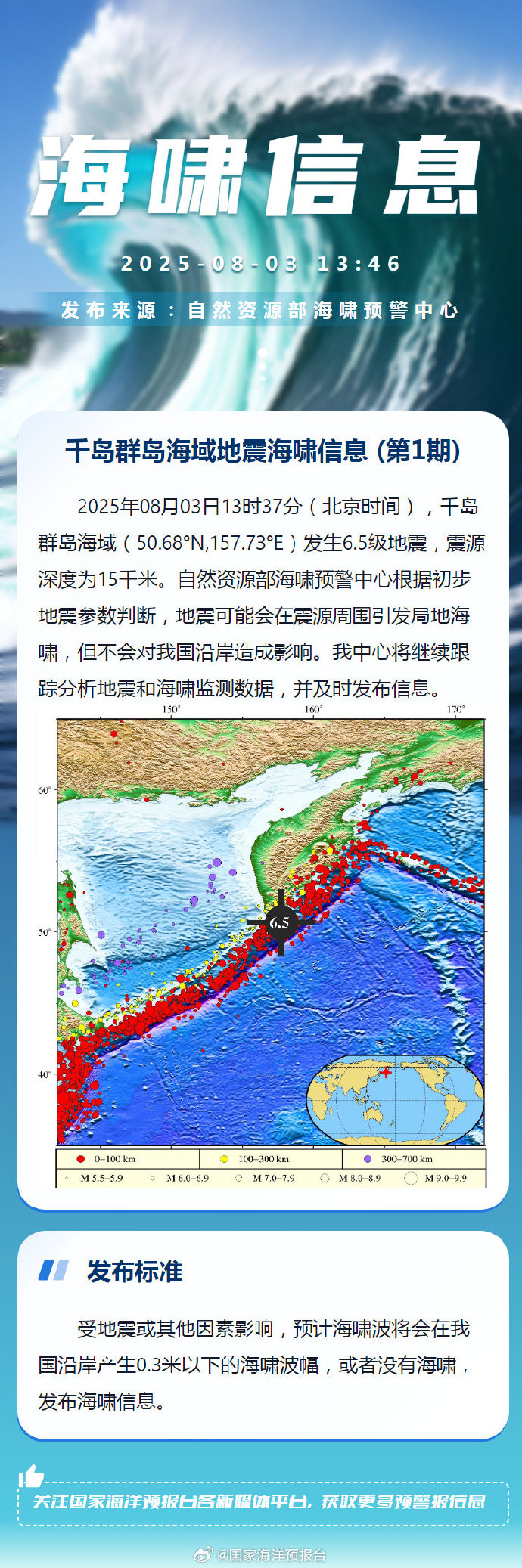 據@國家海洋預報台 消息,8月3日13時37分(北京時間),千島羣島海域發生6.5級地震,震源深度為15千米。自然資源部海嘯預警中心根據初步地震參數判斷,地震可能會在震源周圍引發局地海嘯,但不會對我國沿岸造成影響。我中心將繼續跟蹤分析地震和海嘯監測數據,並及時發佈信息。