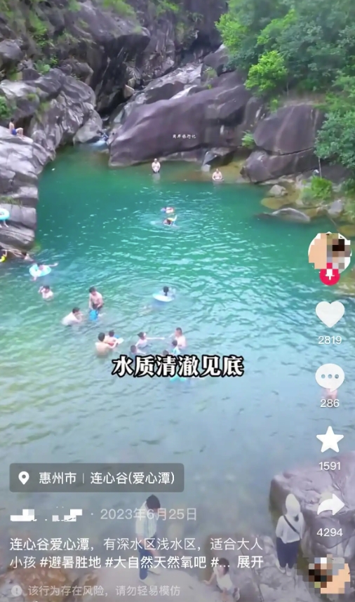 據悉,愛心潭位於惠東縣白盆珠鎮白馬村白馬河畔,是新晉的網紅景點,也叫“連心谷”,不少人前往打卡遊玩。不過有從事文旅的市民表示,愛心潭很危險,是一個網紅景點。