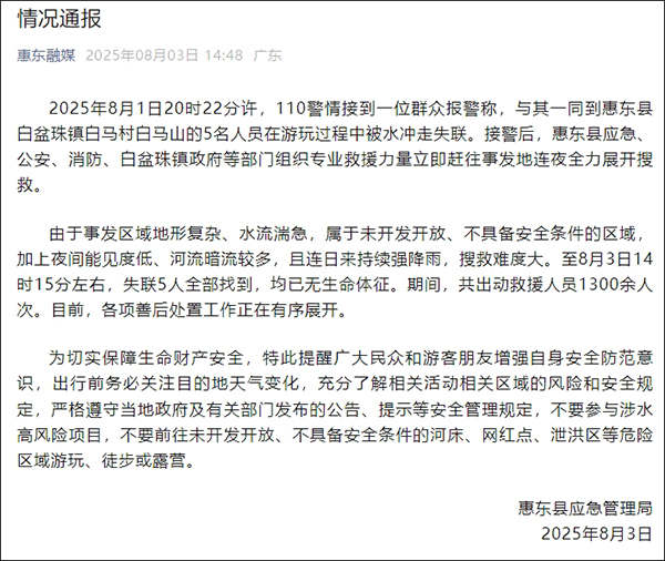據廣東惠東縣微信公眾號“惠東融媒”消息,惠東縣應急管理局8月3日發佈情況通報稱,8月1日20時22分許,110警情接到一位羣眾報警稱,與其一同到惠東縣白盆珠鎮白馬村白馬山的5名人員在遊玩過程中被水沖走失聯。接警後,惠東縣應急、公安、消防、白盆珠鎮政府等部門組織專業救援力量立即趕往事發地連夜全力展開搜救。