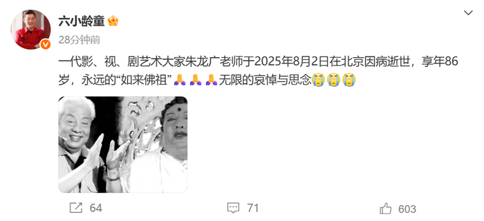3日,六小齡童發文哀悼説:一代影、視、劇藝術大家朱龍廣老師於2025年8月2日在北京因病逝世,享年86歲,永遠的“如來佛祖”,無限的哀悼與思念。