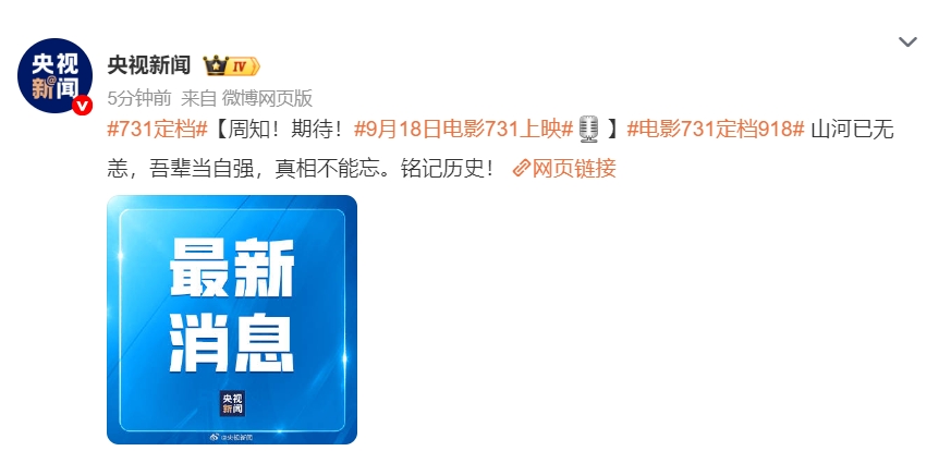 8月3日,央視新聞發佈了電影《731》定檔的消息,半個多月來圍繞着《731》“消失”的種種猜測暫時有了一個明確的説法,各大媒體也接着“官宣定檔”表達了對電影的期待。《731》電影官方微博也發佈了一條“簡潔”的定檔海報呼應這一消息。