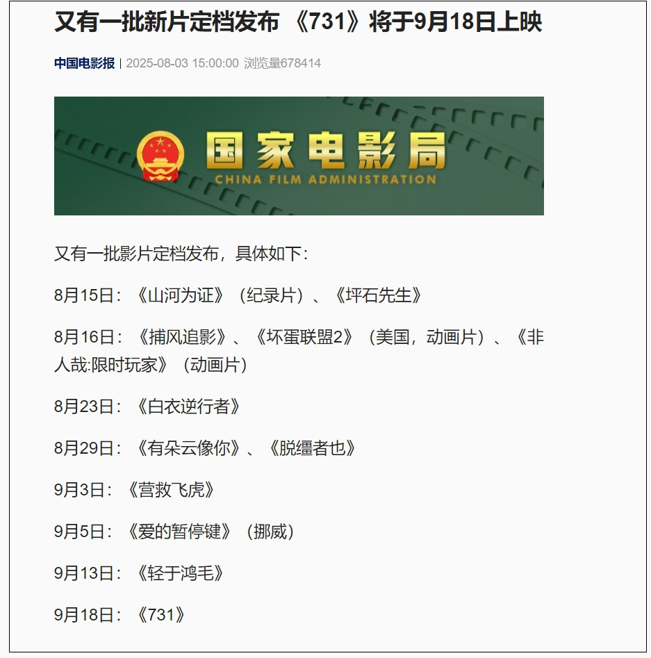 今年是中國人民抗日戰爭暨世界反法西斯戰爭勝利80週年,緊靠抗戰勝利紀念日的這個暑期檔,涉及日軍侵華歷史和中國人民抗戰事蹟的電影自然而然成為熱門題材。7月25日起上映的揭露日軍南京大屠殺暴行的電影《南京照相館》上映後獲得各方好評,預測最終票房已突破40億,成為了2025年繼《哪吒2》之後第二部受到市場追捧的“全民電影”。許多觀眾在《南京照相館》的相關新聞和影評的評論區表達了對《731》上映的期待。