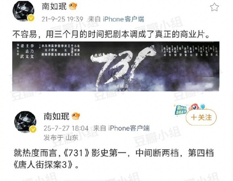 微博上據稱是《731》電影策劃的@南如珉也曾發表過“就熱度而言, 《731》影史第一”“不容易,用三個月時間把劇本調成了真正的商業片”等引發爭議的言論。