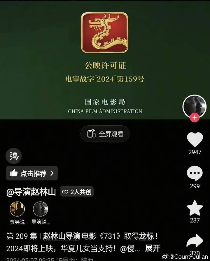 早在2024年,導演就在平台發佈了電影的“龍標”截圖,並表示“電影《731》取得龍標,2024即將上映,華夏兒女當支持”。所謂“龍標”是指電影片公映許可證,是國家電影局對審查合格影片頒發的準映憑證,為電影公映的法定前置條件,未經許可的影片不得發行、放映或進出口。