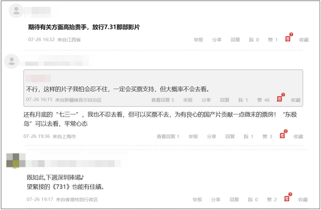 傳言2:《731》電影不能上映是因為接到了大量投訴