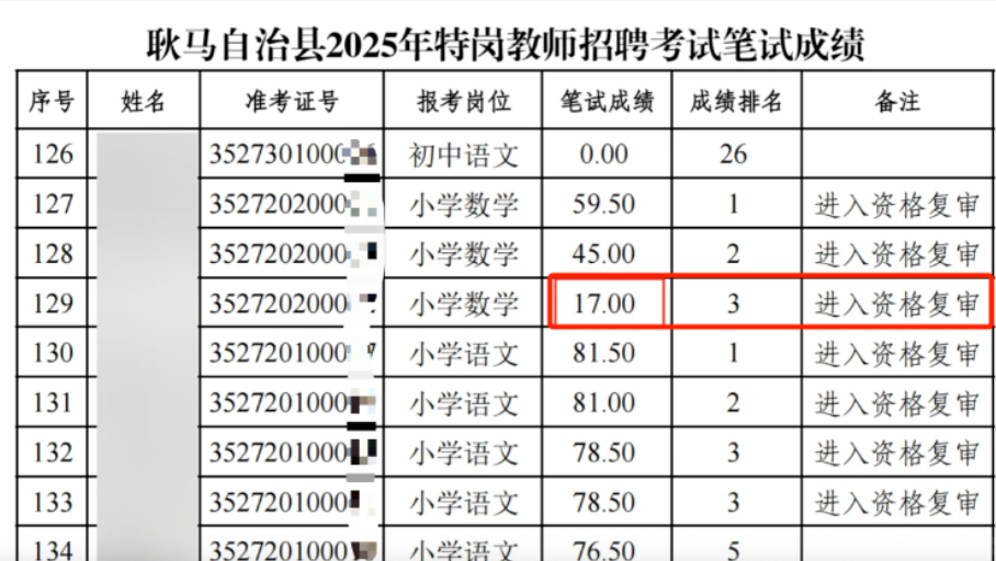 8月3日,雲南省臨滄市耿馬自治縣2025年特崗教師招聘筆試成績公佈,其中一名報考小學數學老師崗位的考生筆試成績僅17分,卻進入資格複審。此事引發網民熱議,不少網友稱“17分創造奇蹟”,也有人分析,“這樣的筆試成績,面試環節應該過不到”。