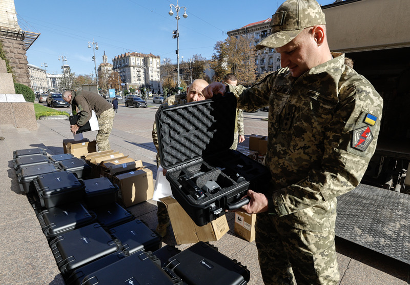 當地時間2024年10月22日,烏克蘭基輔,烏克蘭士兵將無人機裝載至卡車上。 東方IC