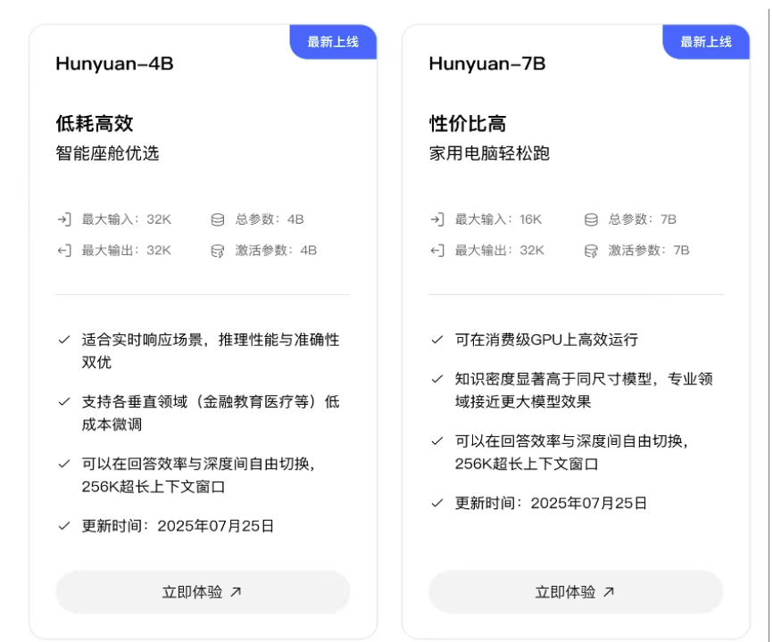 8月4日,騰訊混元宣佈開源四款小尺寸模型,參數分別為 0.5B、1.8B、4B、7B,消費級顯卡即可運行,適用於筆記本電腦、手機、智能座艙、智能家居等低功耗場景,且支持垂直領域低成本微調。
