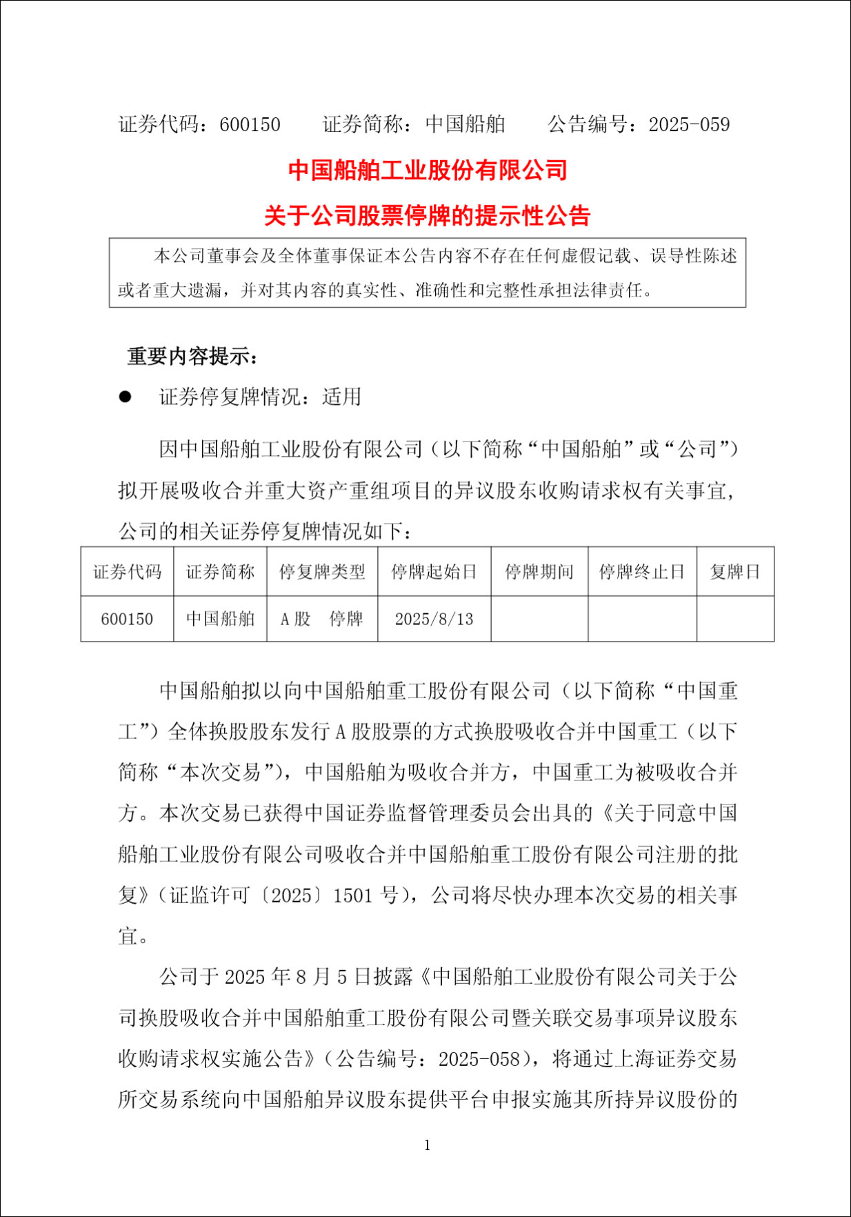 8月4日晚間,中國船舶公告稱,公司擬開展吸收合併重大資產重組項目的異議股東收購請求權有關事宜,公司股票將自2025年8月13日開市起連續停牌,並將於刊登異議股東收購請求權申報結果公告當日復牌。
