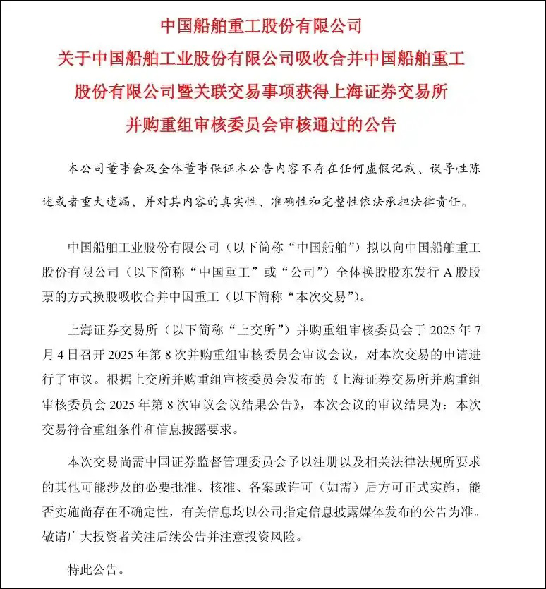7月18日晚間,中國船舶及中國重工雙雙披露,中國船舶吸收合併中國重工事項已獲得中國證監會同意註冊批覆。