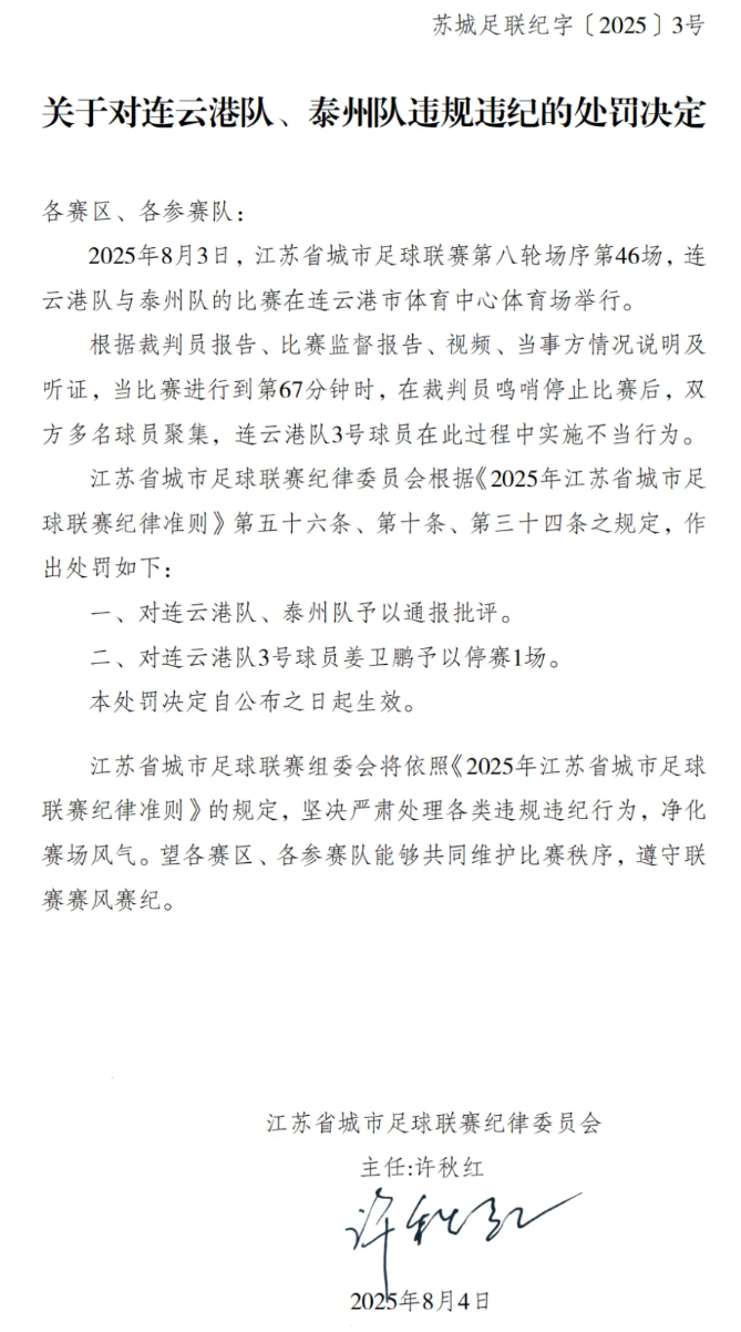 蘇超紀委根據《2025年江蘇省城市足球聯賽紀律準則》第五十六條、第十條、第三十四條之規定,對連雲港隊、泰州隊予以通報批評;對連雲港隊3號球員姜衞鵬予以停賽1場。本處罰決定自公佈之日起生效。