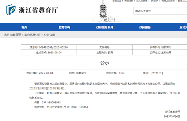 根據高校設置有關規定及要求,現將紹興文理學院更名為紹興大學、湖州師範學院更名為湖州師範大學向社會公示,公示時間為2025年8月4日至2025年8月8日。