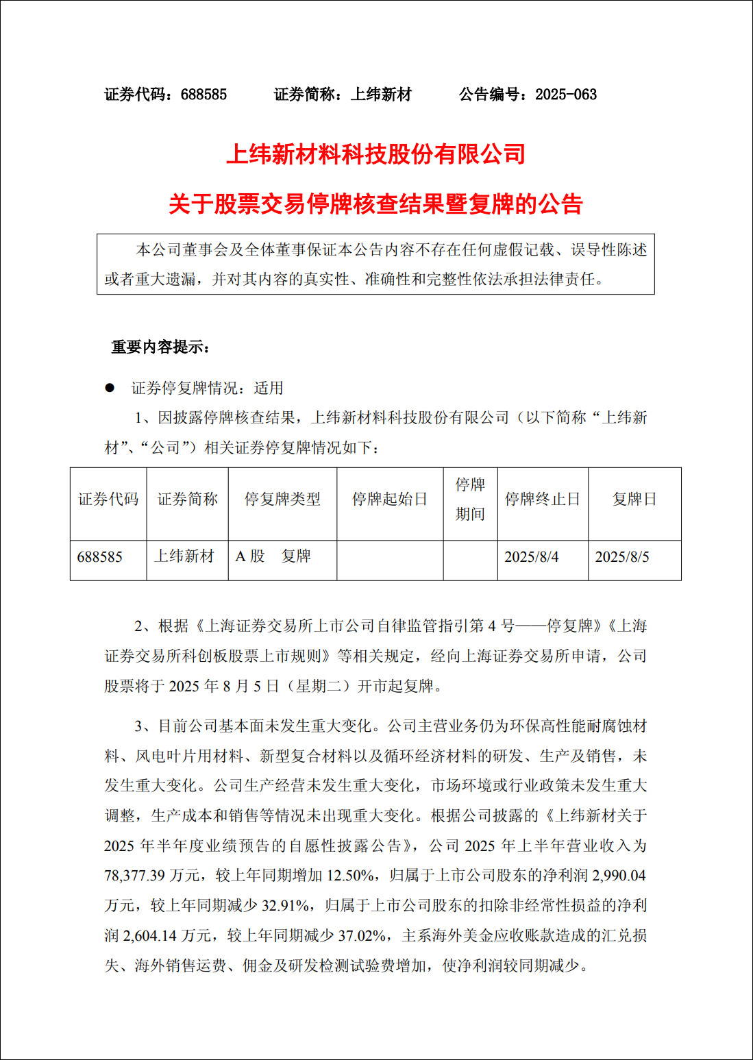 公告還提到,公司股票自2025年7月9日至2025年7月30日期間多次觸及股票交易異常波動及嚴重異常波動情形。為維護投資者利益,公司就股票交易異常波動及嚴重異常波動情況進行停牌核查。經向上海證券交易所申請,公司股票於2025年7月31日(星期四)開市起停牌,自披露核查公告後復牌。