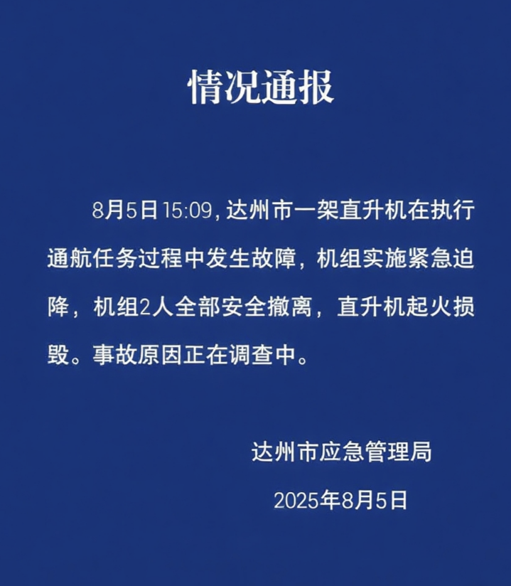 四川達州:一直升機緊急迫降,2人安全撤離 guancha 2025-08-05 據微信公眾號“達州應急”消息,8月5日15:09,四川達州市一架直升機在執行通航任務過程中發生故障,機組實施緊急迫降,機組2人全部安全撤離,直升機起火損毀。事故原因正在調查中。