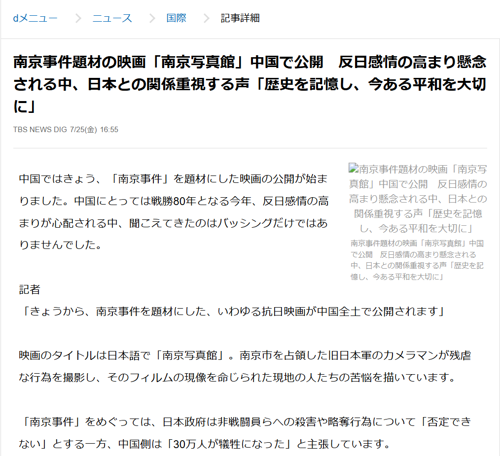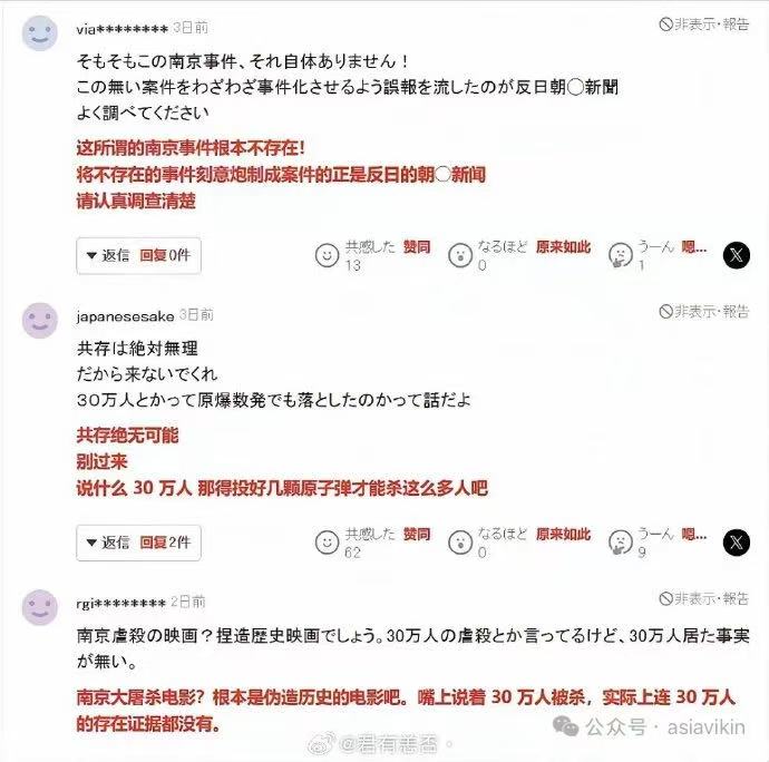 電影上映後,不僅在中國國內頗受關注,日本也有新聞報道。25日上映當天,相關報道一發出便引起了日本右翼的強烈抗議。當然,這幫人的説辭還是老一套,諸如“南京大屠殺不存在”、“30萬人人數造假”等,這些都是幾十年前就常見的論調。