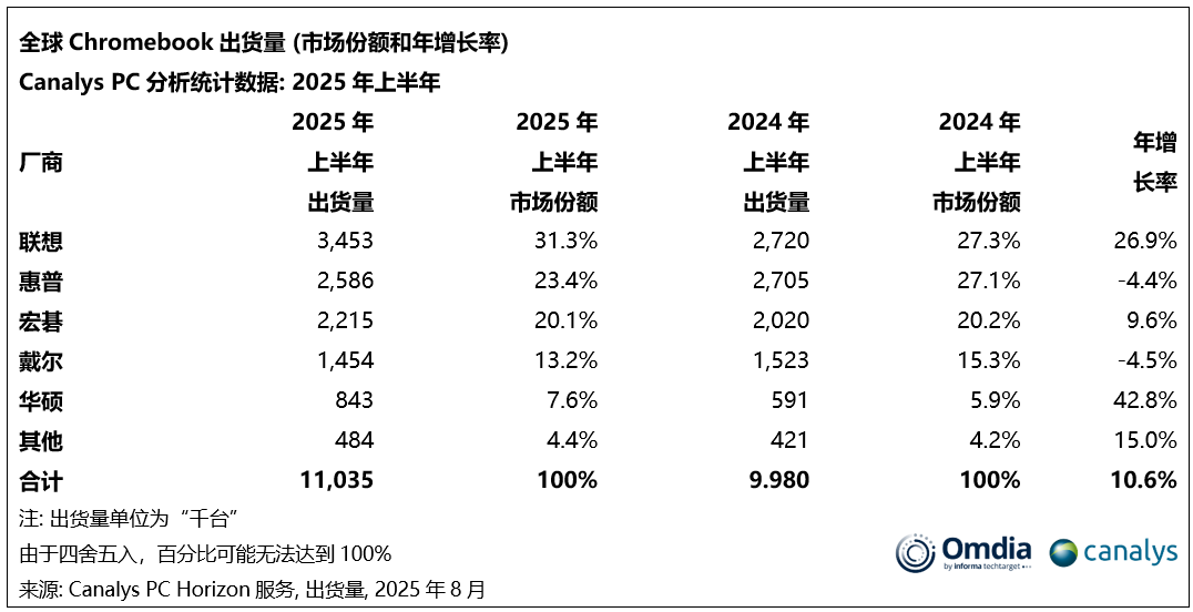 2025年上半年,聯想憑藉在日本GIGA學校項目中的重要地位,領先全球Chromebook市場,出貨量達到350萬台,同比增長27%。惠普位列第二,但市場份額被聯想搶佔,年出貨量同比小幅下降4%。作為亞洲市場的重要品牌,宏碁實現了10%的健康增長,出貨量達220萬台。戴爾排名第四,出貨量為150萬台,同比下降5%。華碩憑藉GIGA項目帶動的需求表現強勁,出貨量達到80萬台,同比增長43%,躋身前五。