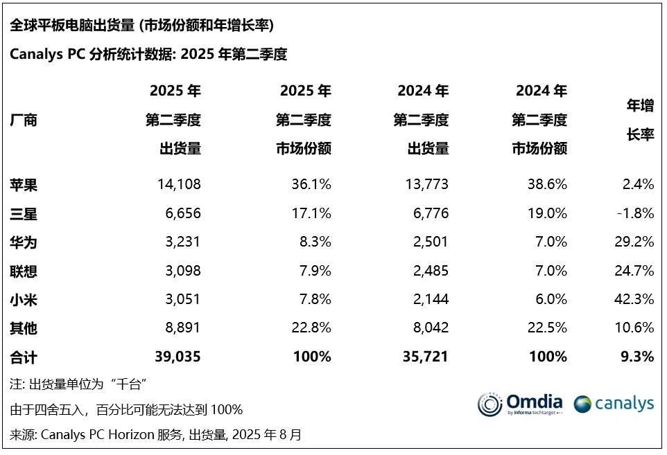 8月6日,市場調研機構Canalys發佈的數據顯示,2025年第二季度全球平板電腦出貨量達到3900萬台,同比增長9%,實現連續六季度增長,環比增長5%。這一表現主要得益於中國和EMEA(歐洲、中東和非洲)地區的穩定需求。