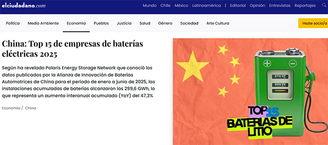 這家智利主流媒體引用北極星儲能網的報道稱,根據中國汽車動力電池創新聯盟發佈的數據披露,2025年1月至6月期間,中國動力電池裝機總量達到299.6 GWh,同比增長47.3%。