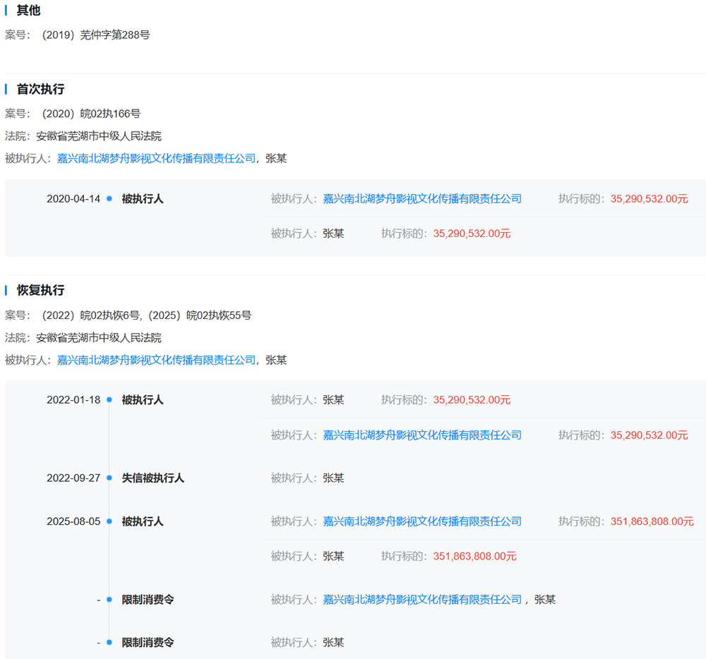 據天眼查消息,8月5日,張若昀父親張健及嘉興南北湖夢舟影視文化傳播有限責任公司新增一則恢復執行信息,執行標的3.51億餘元,執行法院為安徽省蕪湖市中級人民法院。