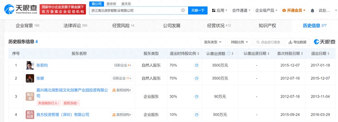 歷史股東信息顯示,張若昀父親張健曾為浙江南北湖夢都影業有限公司股東,2015年其所持股份轉給張若昀,2017年張若昀退出股東行列。此後,張若昀還曾因確認合同無效糾紛起訴該公司。