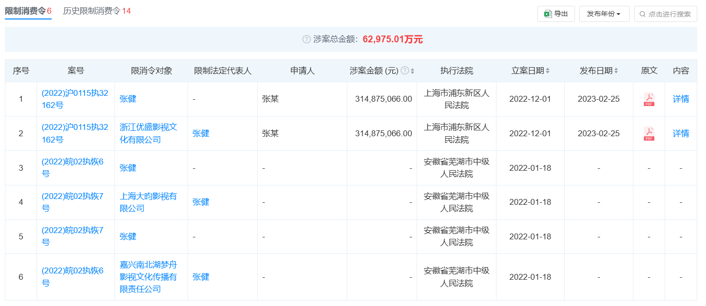 目前,張健及該公司涉一起合同糾紛已被限制高消費。此外,張建還因多項被執行令而被限制高消費,涉案總金額6.29億餘元。