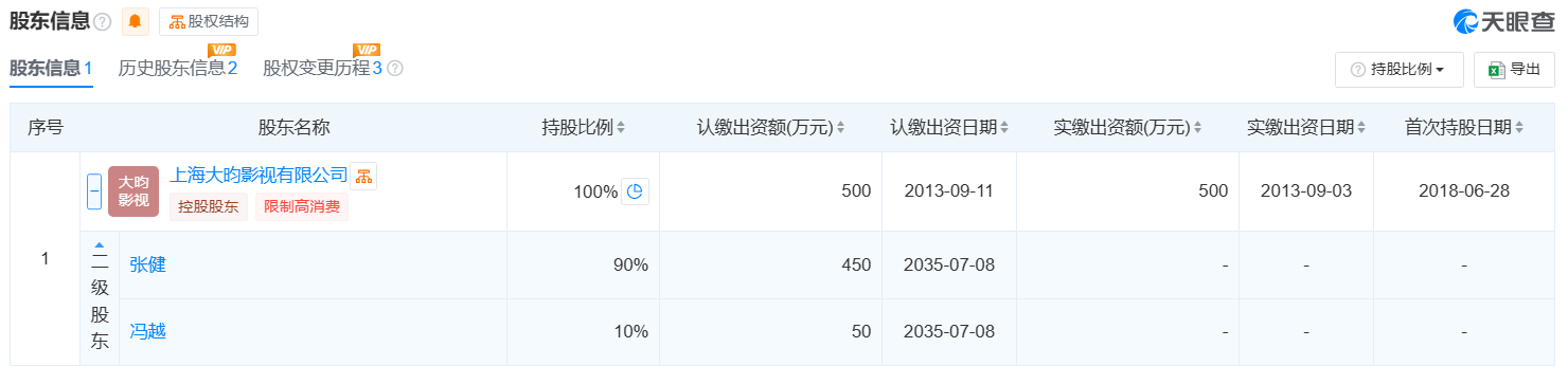 天眼查信息顯示,嘉興南北湖夢舟影視文化傳播有限責任公司成立於2013年9月,張健擔任法定代表人、執行董事、經理,張健通過上海大昀影視有限公司間接持有該公司90%股權。