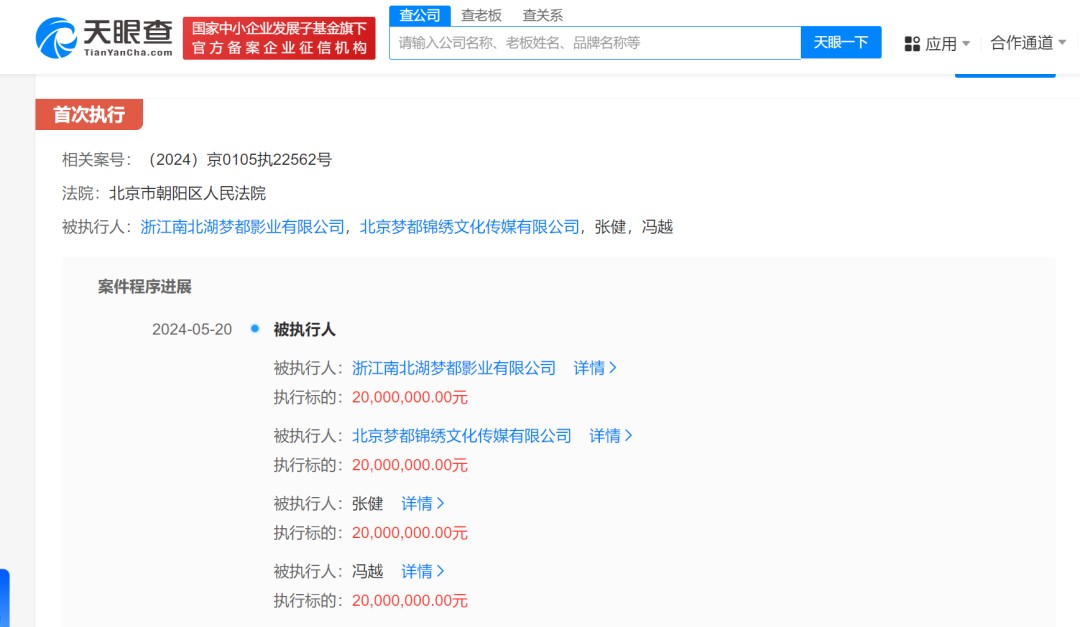 天眼查App顯示,2024年5月20日,浙江南北湖夢都影業有限公司、北京夢都錦繡文化傳媒有限公司、張健(演員張若昀父親)、馮越新增一則被執行人信息,執行標的2000萬元,執行法院為北京市朝陽區人民法院。