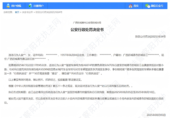 8月5日,廣西八桂警察陽光執法網公佈廣西防城港市公安局防城分局公安行政處罰決定書:
