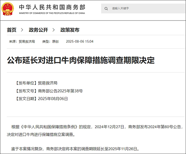 商務部網站8月6日發佈公告:根據《中華人民共和國保障措施條例》的規定,2024年12月27日,商務部發布2024年第60號公告,決定對進口牛肉進行保障措施立案調查。
