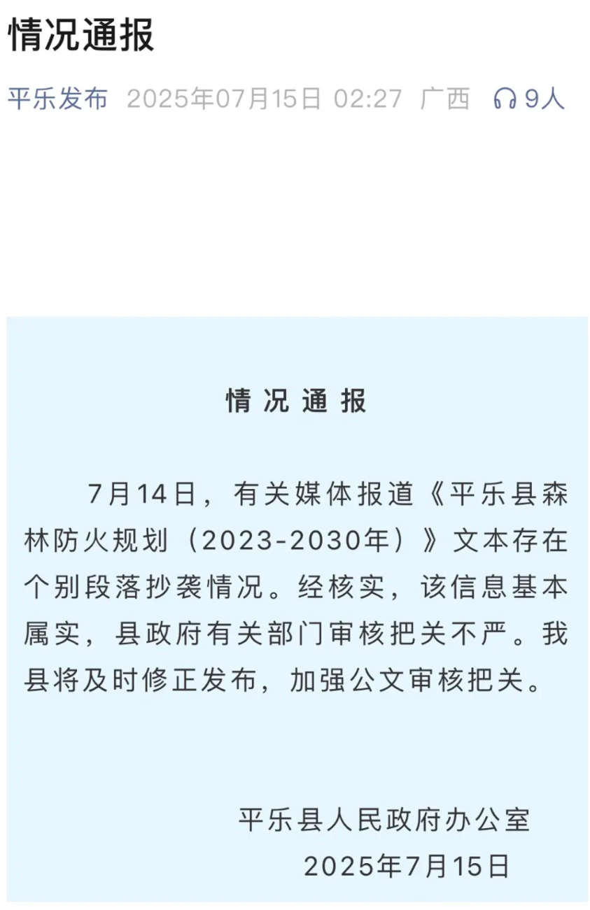 其中,山西忻州市五台縣7月9日的一篇縣長調研稿,與7月5日五台山景區黨工委副書記調研稿內容高度雷同,全文約390字中,有超過320字重複;而廣西平樂縣發佈的《平樂縣森林防火規劃(2023—2030年)》中,關於平樂縣的水文數據與500多公里之外的湖南安化縣介紹文本幾乎一模一樣,甚至安化縣的鄉鎮名都未作修改,出現了“平樂指導安化”的鬧劇。