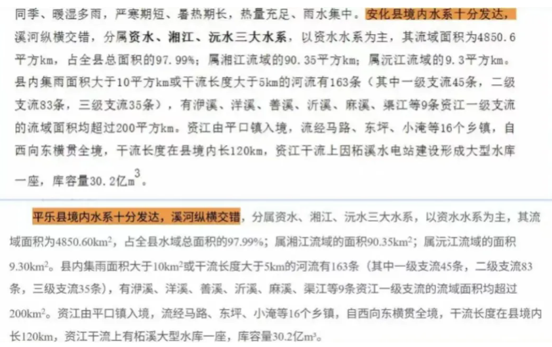 有網友發現,平樂縣和安化縣的水文數據一模一樣。(網絡截圖)