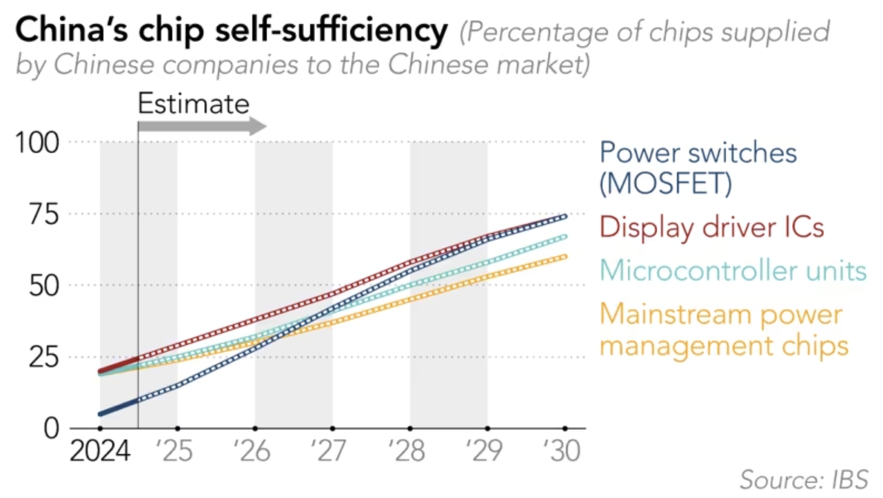 國際商業戰略公司(IBS)估算稱,中國微控制器(MCU)芯片的自給率有望快速提升,從2024年的19%升至2030年的67%;同期,碳化硅功率開關芯片的國產率也將從5%增長至74%。