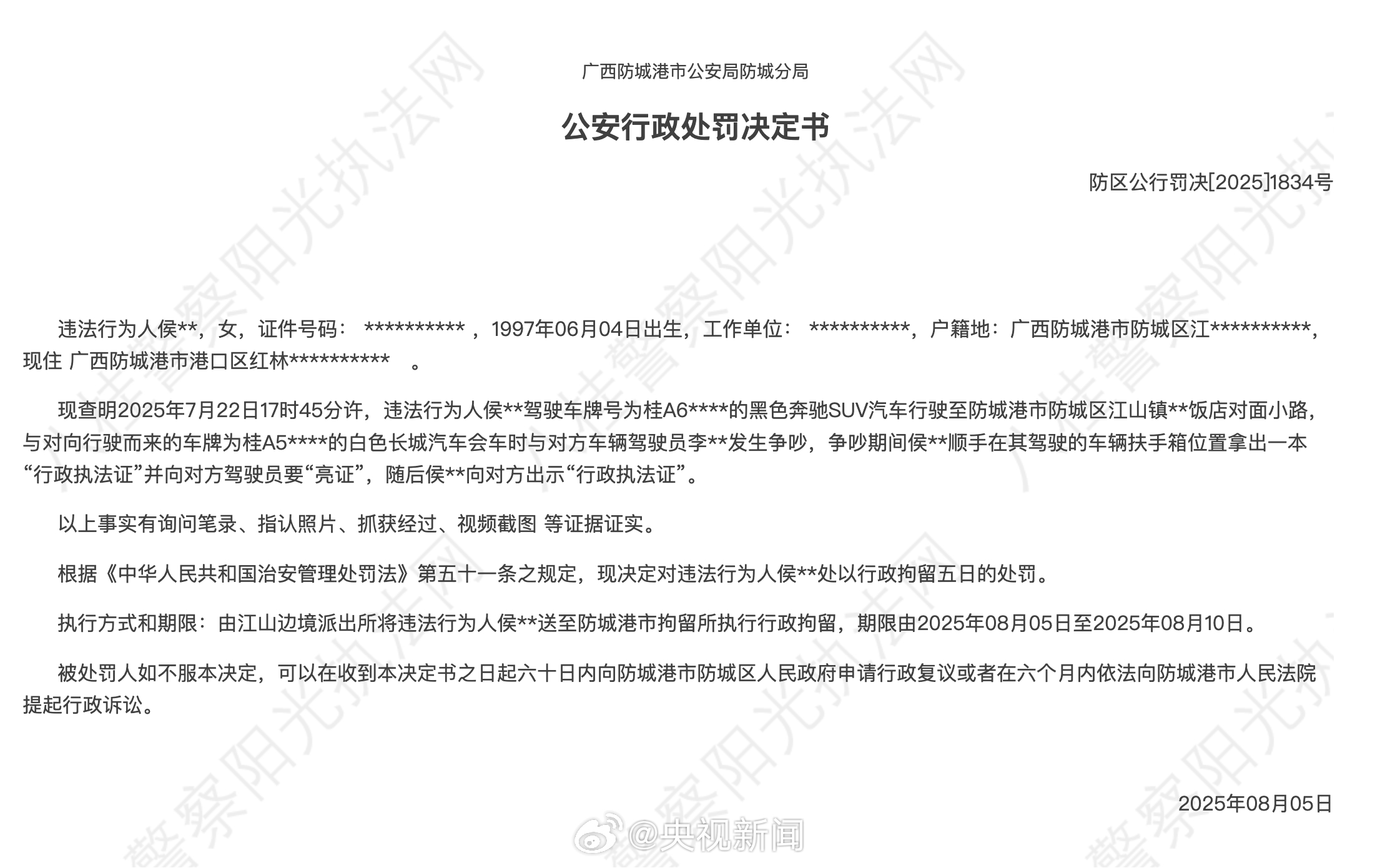 8月5日,廣西防城港“亮證姐”被處以行政拘留5天,“亮證姐”事件有了一個結果,也算是一個交代。但細心的網友發現,當地警方最初公開的行政處罰決定書上,給處罰對象“亮證女”匿名,而受害方“平頭哥”李先生的姓名和車牌號卻被公示出來,這是無心之過,還是有意為之,令人產生疑惑,客觀上成為又一個需要向公眾做出交代的問題。