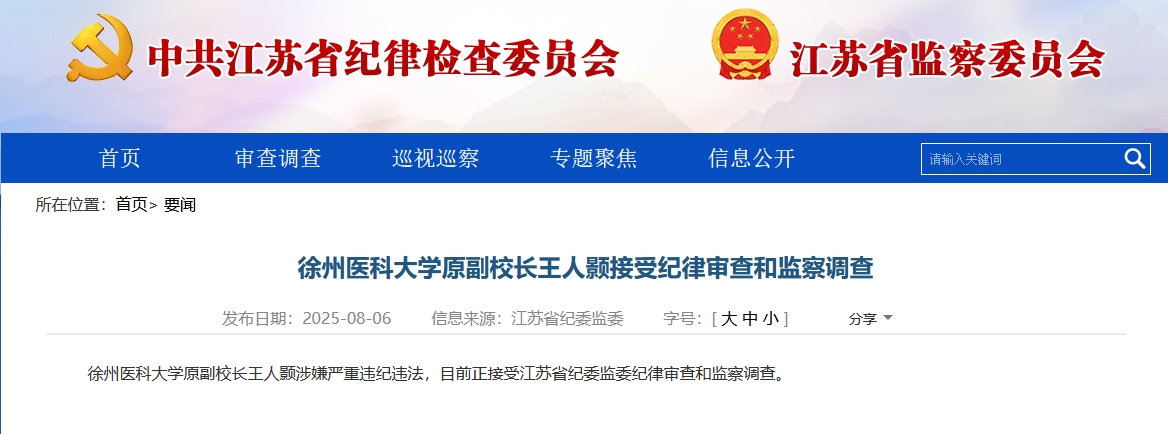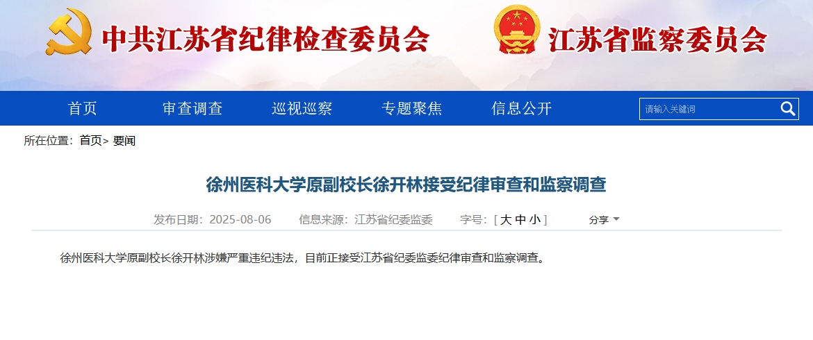 據清廉江蘇網站消息,8月6日,江蘇省紀委監委同時通報:徐州醫科大學原副校長王人顥、徐開林涉嫌嚴重違紀違法,目前正接受江蘇省紀委監委紀律審查和監察調查。