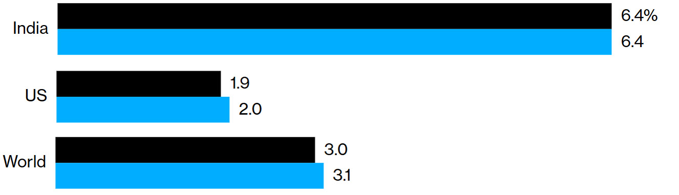 IMF對印美經濟增長率的預測(黑色為2025年,藍色為2026年) 彭博社製圖