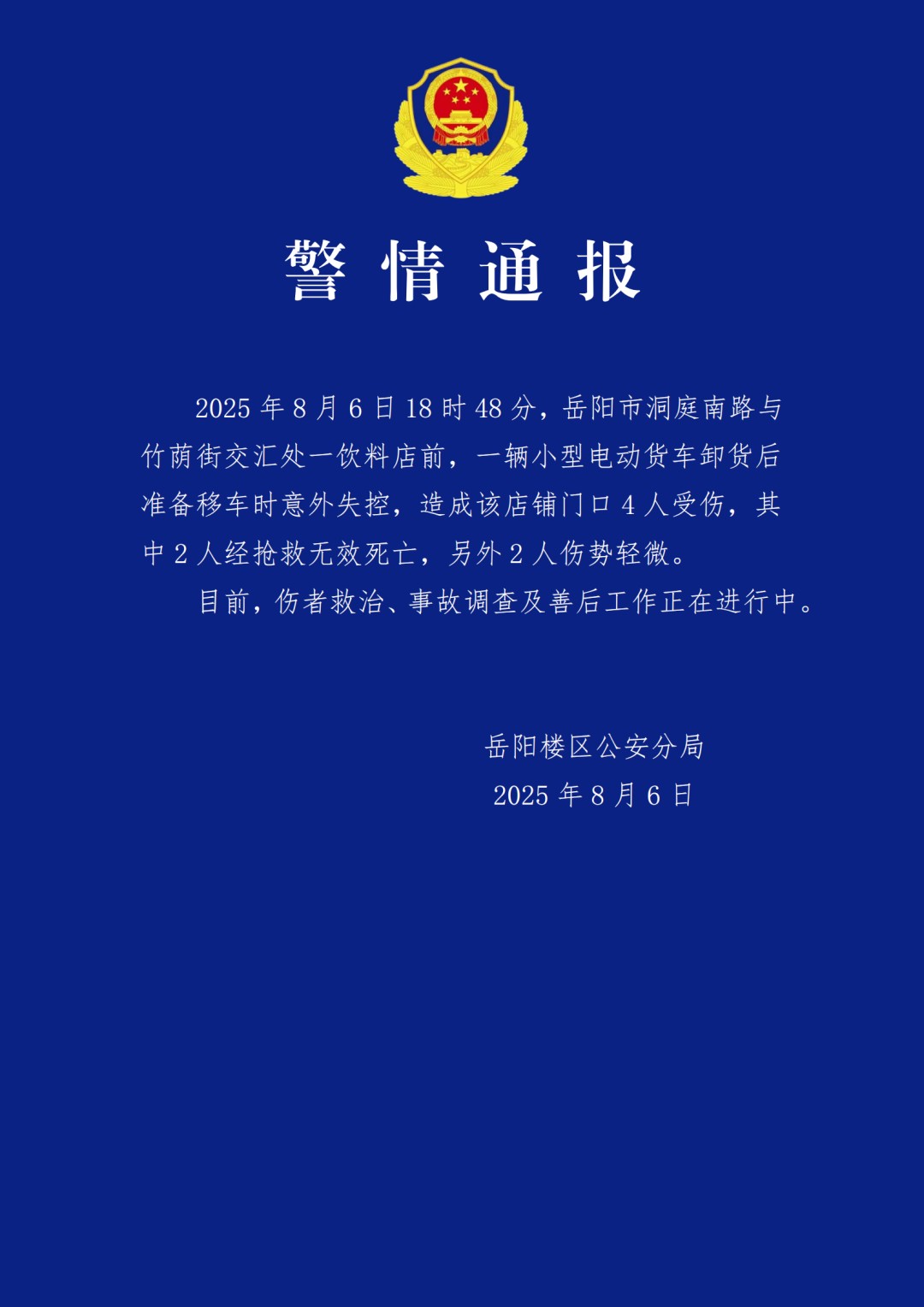 2025年8月6日18時48分,岳陽市洞庭南路與竹蔭街交匯處一飲料店前,一輛小型電動貨車卸貨後準備移車時意外失控,造成該店鋪門口4人受傷,其中2人經搶救無效死亡,另外2人傷勢輕微。