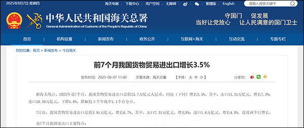 海關總署網站8月7日消息,海關總署公佈前7個月我國貨物貿易進出口數據。