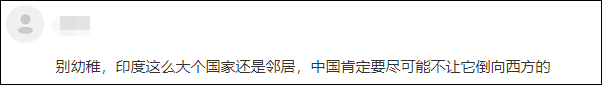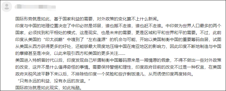 還有網民則頗為理性地分析了對於印度、中印關係以及國際政治形勢的看法,國際關係本來就是基於“利益”,和印度搞好關係對中國來説也是十分重要的: