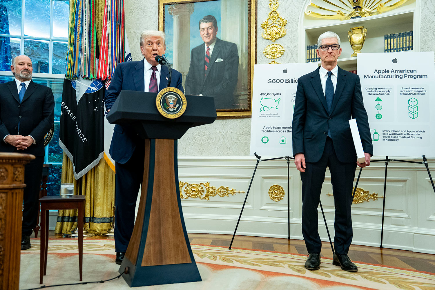 當地時間2025年8月6日,美國華盛頓特區,美國總統特朗普與蘋果公司首席執行官庫克共同宣佈,蘋果將向美國本土追加投資1000億美元 IC photo