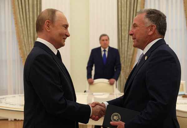 當地時間8月6日,普京(左)在克里姆林宮會見美國中東問題特使威特科夫。 克里姆林宮網站