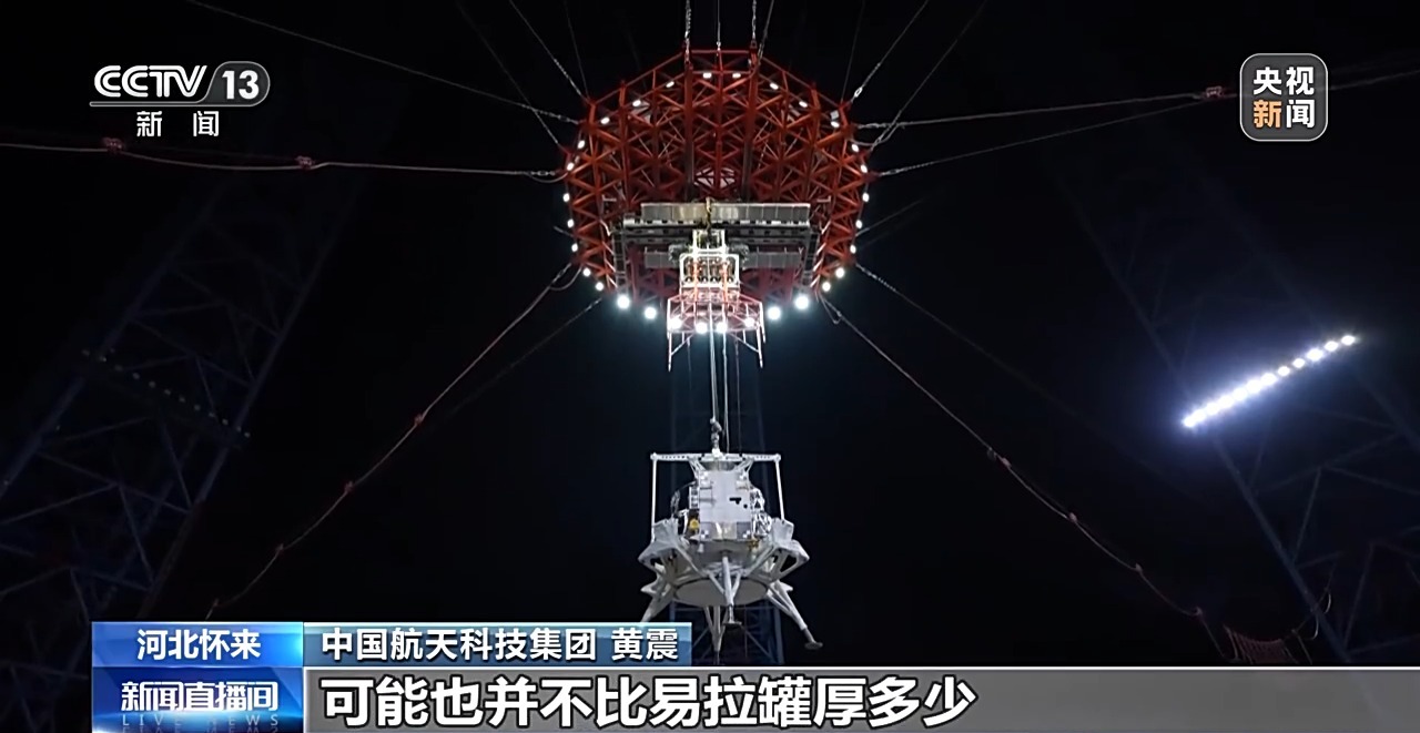 中國航天科技集團 黃震:所以攬月着陸器負責的使命是非常多的,設計挑戰的難度非常大的。也就是説,每一點的重量都要把它掰成幾瓣來用,所以在一體化設計上做到了極致,在輕量化設計上也做到了極致。看起來很堅固的一個結構,實際上它最薄處的厚度可能也並不比易拉罐厚多少,所以每個地方都想盡辦法讓它儘可能更加輕,實現了用最小的發射重量來實現最為複雜、最為精巧的設計。