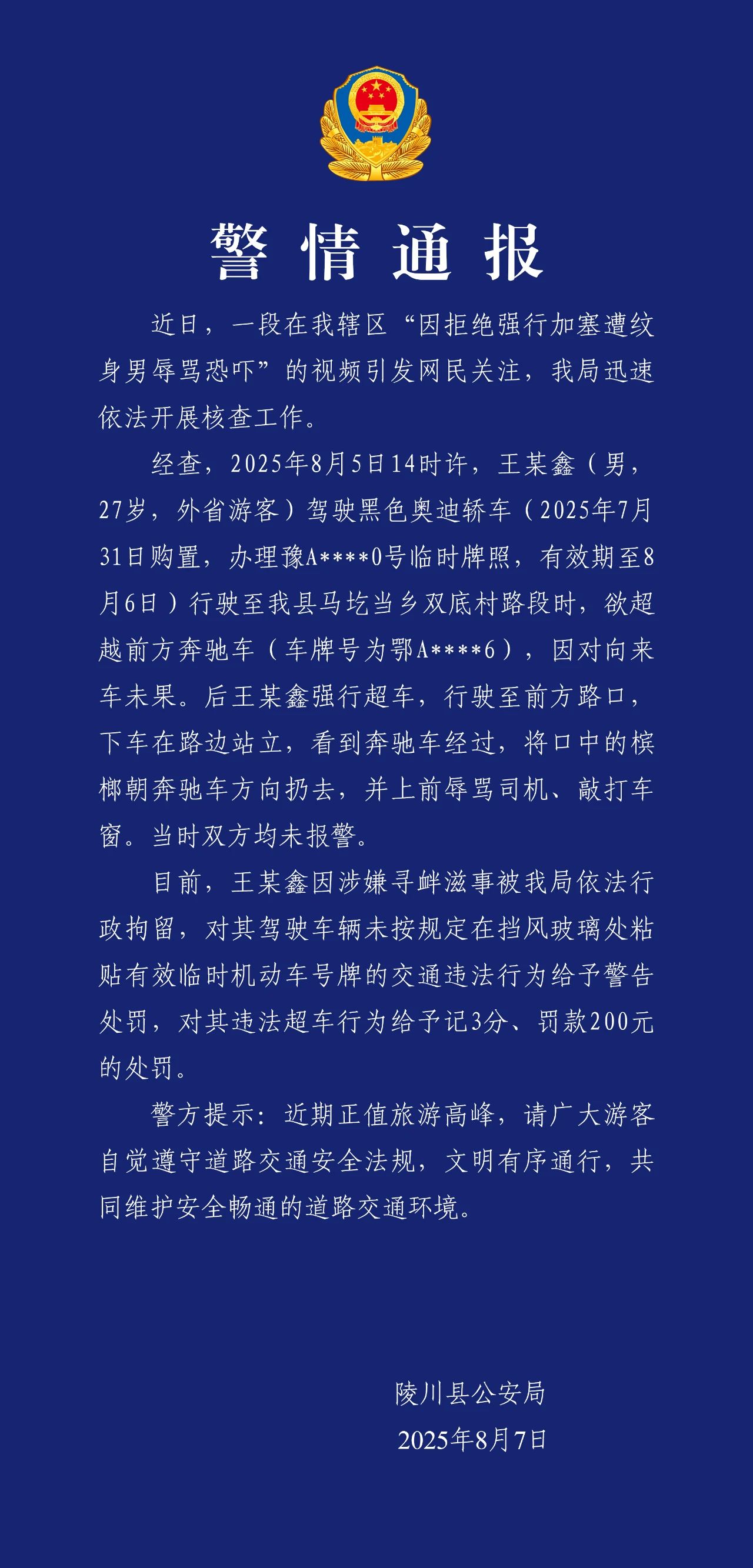 經查,2025年8月5日14時許,王某鑫(男,27歲,外省遊客)駕駛黑色奧迪轎車(2025年7月31日購置,辦理豫A****0號臨時牌照,有效期至8月6日)行駛至我縣馬圪當鄉雙底村路段時,欲超越前方奔馳車(車牌號為鄂A****6),因對向來車未果。后王某鑫強行超車,行駛至前方路口,下車在路邊站立,看到奔馳車經過,將口中的檳榔朝奔馳車方向扔去,並上前辱罵司機、敲打車窗。當時雙方均未報警。