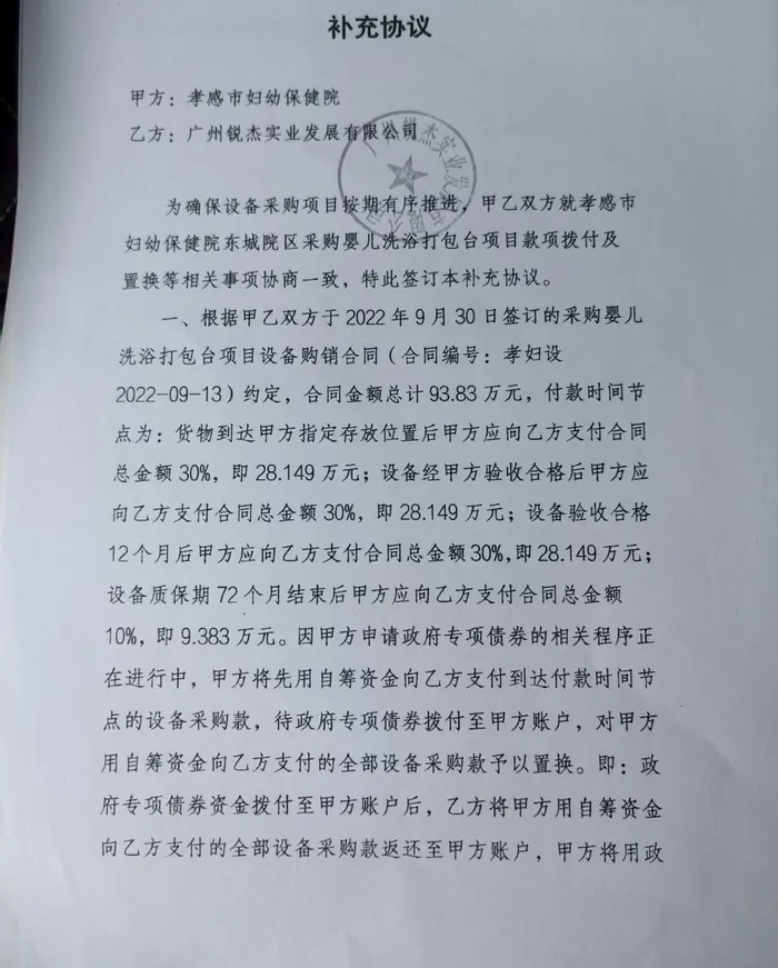 鄭某傑介紹,2022年5月11日,鋭傑公司中標了孝感婦幼保健院嬰兒洗浴打包台整體項目。當年9月,雙方簽訂了購銷合同,約定合同金額為93.83萬元,並且詳細約定了分期付款方式。此後,雙方又簽署了一份補充協議,進一步細化了付款方式。根據協議,付款時間節點為:貨物到達甲方指定存放位置後,甲方應向乙方支付合同總金額30%,即28.149萬元;設備經甲方驗收合格後,甲方應向乙方支付合同總金額30%,即28.149萬元;設備驗收合格12個月後,甲方應向乙方支付合同總金額30%,即28.149萬元;設備質保期72個月結束後,甲方應向乙方支付合同總金額10%,即9.383萬元。