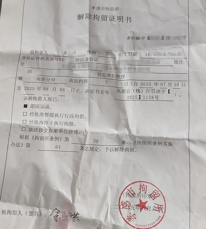 因長時間未拿到工程費用,2025年7月底,餘某洪和鄭某福二人趕至孝感婦幼保健院“討薪”,後因情緒激動出現過激行為,被當地警方以“擾亂單位秩序”為由拘留7日,拘留日期為2025年7月30日至8月6日。